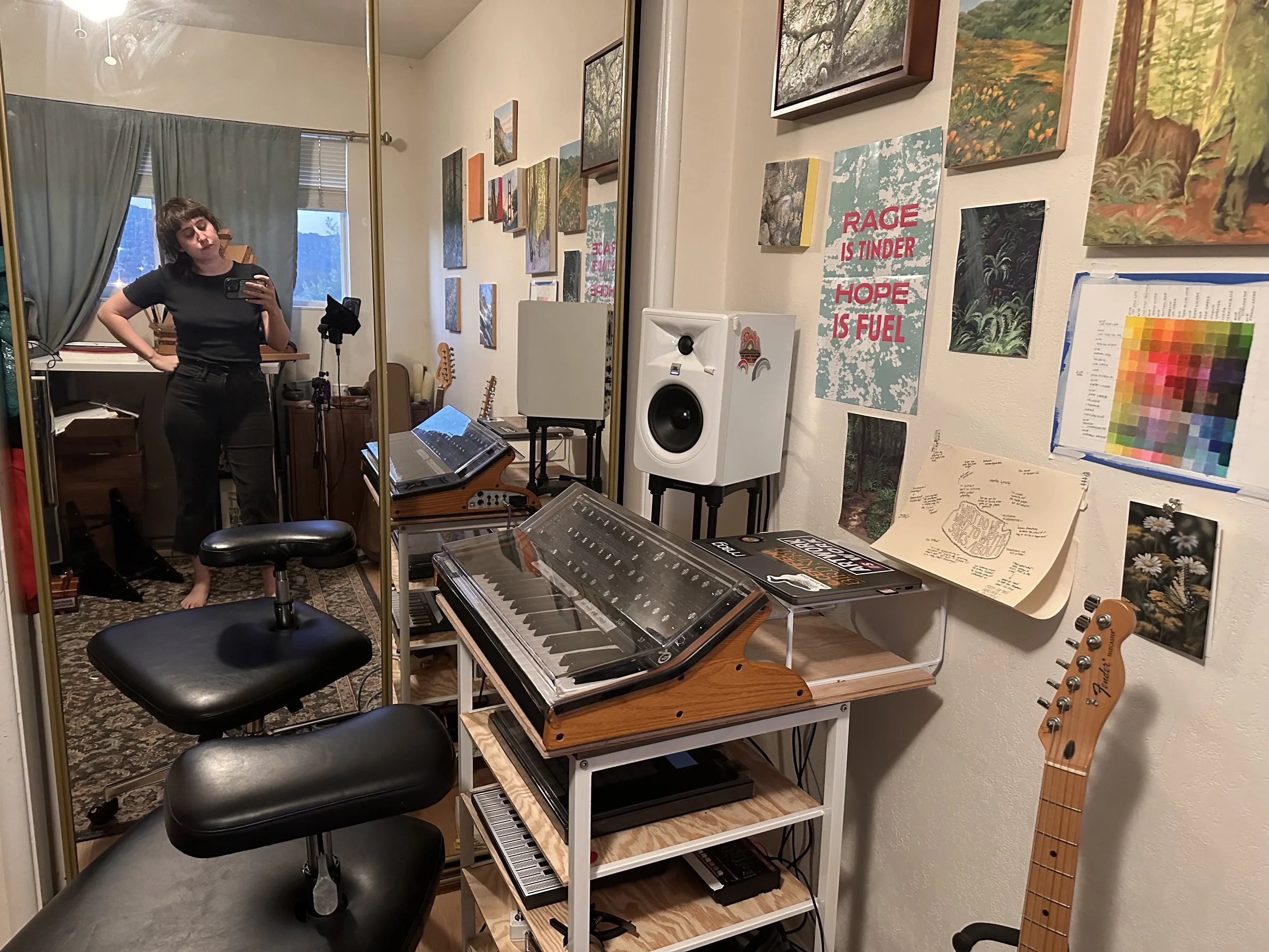 feeling: bittersweet. I loved the floor space and might find a way to bring it back somehow in my extremely tiny 60 sqft space, but I have to consider my body and disabilities when setting things up to be kind to myself. I put guitar pedals next to me on the floor yesterday and tripped over them more than once, so I really had to come to terms with the fact that I had become a hazard to my own health. This is a much more compassionate space that will allow me to make for longer, and I need to add some good rock collections to the shelves to help it feel a bit more magical again.
